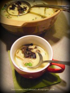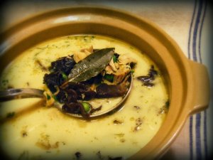 amikor a csirke már megpuhult, kiveszem és beleteszem a gombákat. Amíg a a gombák főnek a húst lefejtem a csontról, és apróbb, falatnyi kockákra vágom fel és visszadobom főni.
