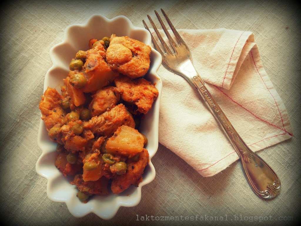 A zsíron megpirítom a hagymát, míg üveges nem lesz, majd lehúzom a tűzről és rádobom a paprikát és a fűszereket. Keverek egyet rajta, és jöhet a 3*3 centis kockákra vágott csirkemell, amit szépen minden oldaláról megpirítok. Ha színt kap, jöhet bele az ugyanekkorára vágott krumpli, amit addig kevergetek, míg szintén kap egy kis színt. Most jöhet a borsó is, és a fedő.